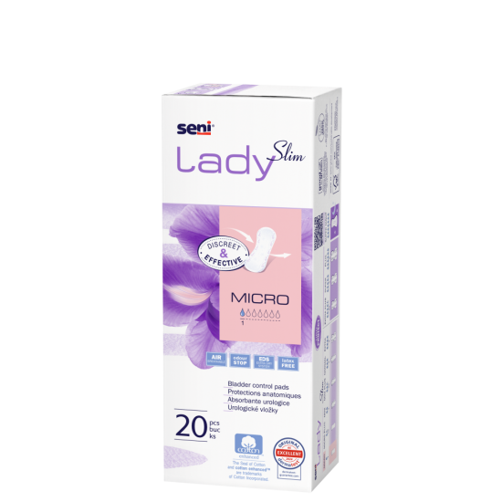 Absorbante urologice Seni Lady Slim Micro – reprezintă soluţia perfectă pentru femeile care se confruntă cu probleme de incontinenţă de picătură. Seni Lady Slim Micro sunt foarte subţiri şi discrete, cu un sistem suplimentar de distribuție a umezelii (EDS) și suprafaţă din nețesut delicat îmbogăţit cu fibre de bumbac.