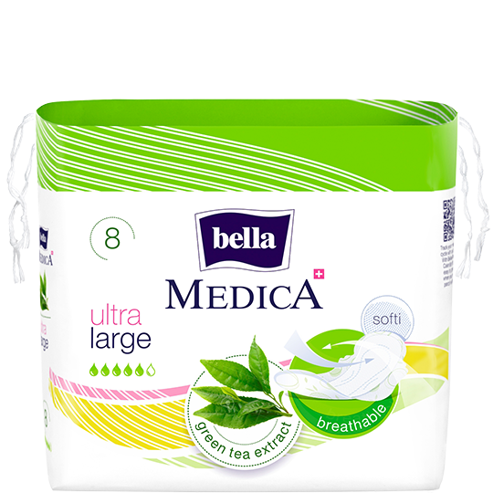 Absorbante igienice subţiri Bella Medica, cu extract de ceai verde, recomandate femeilor cu pielea foarte sensibilă. Suprafaţa naturală Softi, foarte moale şi delicată, permite pielii să respire. Stratul superior special asigură o absorbţie rapidă. Recomandate pentru un flux menstrual abundent.